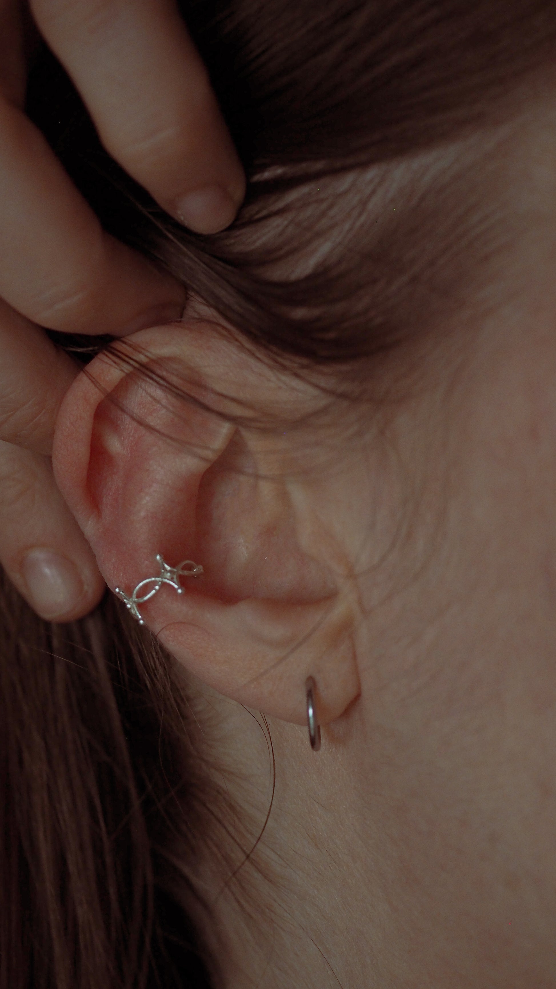 An earcuff is an earring that requires no piercing. It effortlessly rests on the ear, thanks to its anatomical design. It neither squeezes nor applies pressure on the cartilage, providing a weightless experience.