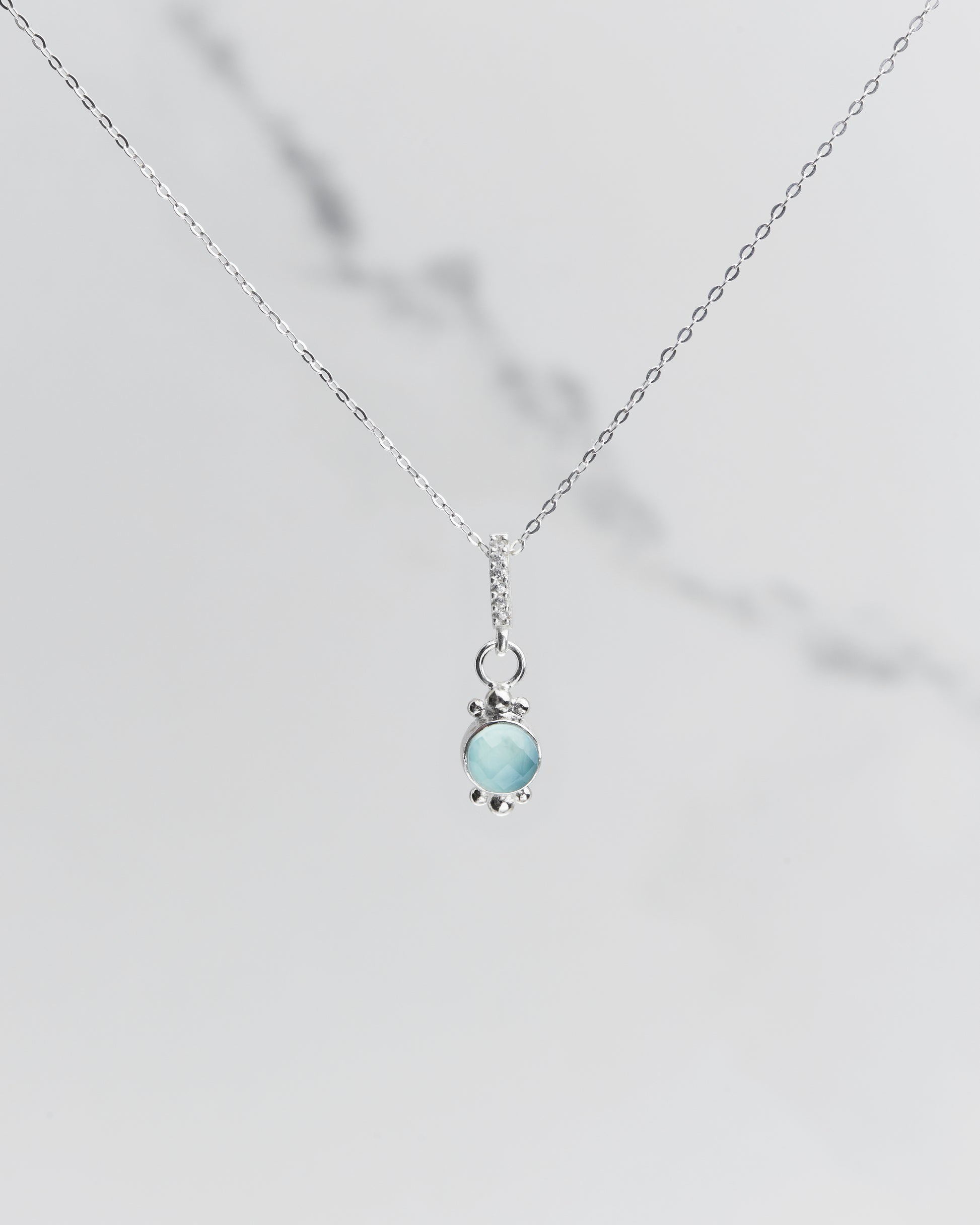 The Due drop pendant is adorned with a rose-cut gemstone, hanging on a thin 40cm chain.