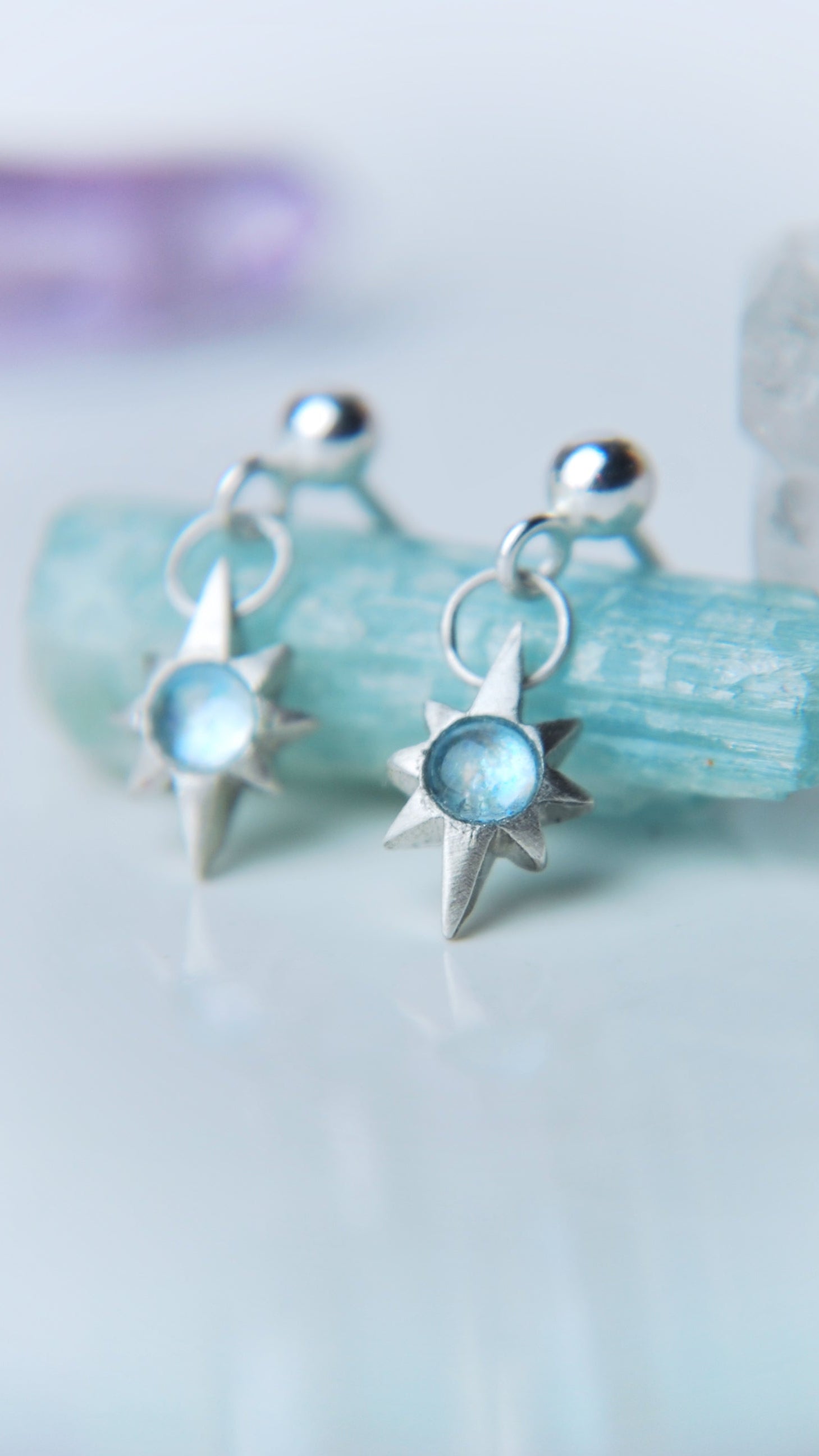The earrings are tiny, which means they weigh next to nothing and can be worn without taking them off at night. Within the star charms there are cabochons of moonstone. As the head moves, the earrings gently sway, and the stones shimmer with a soft glimmers.