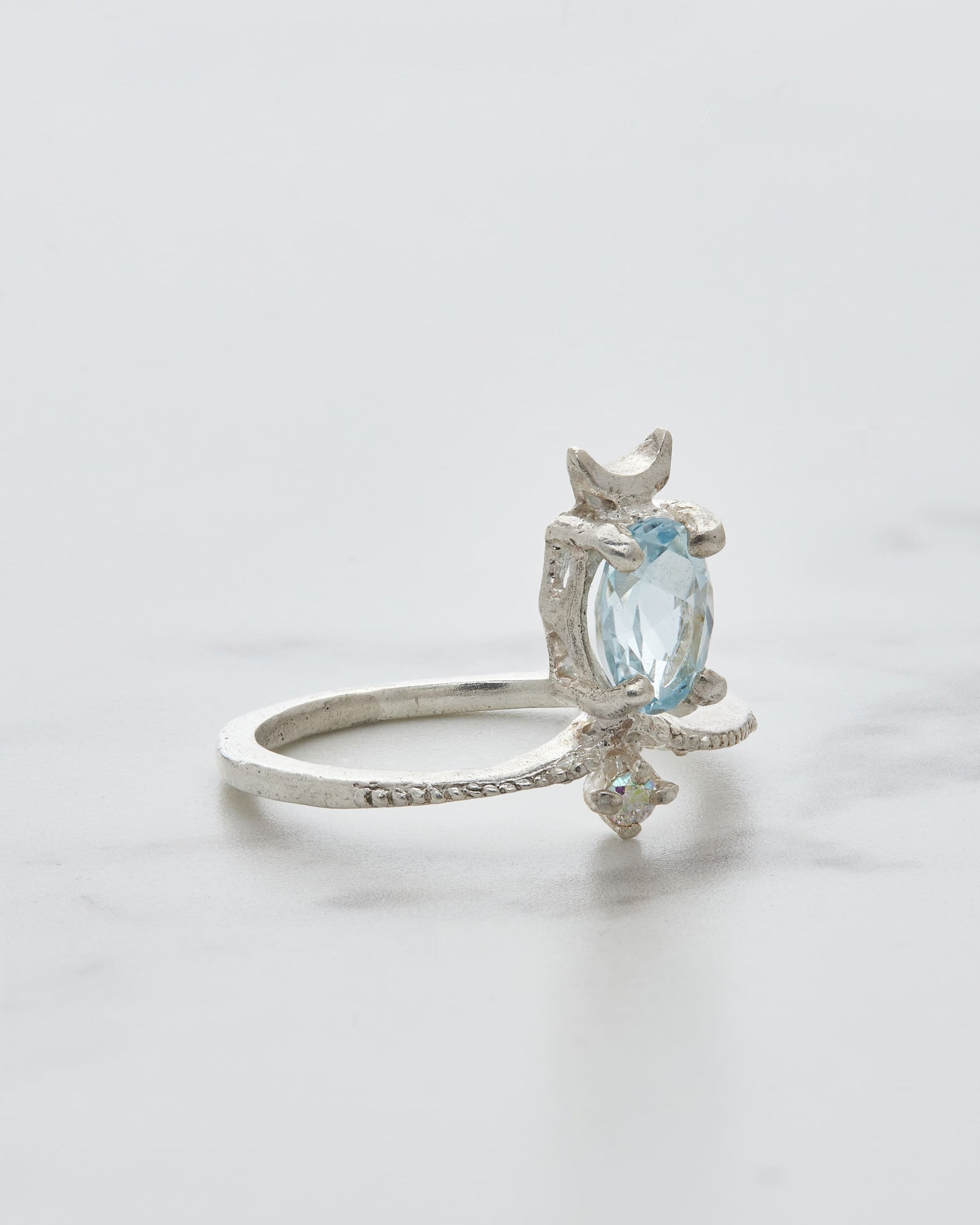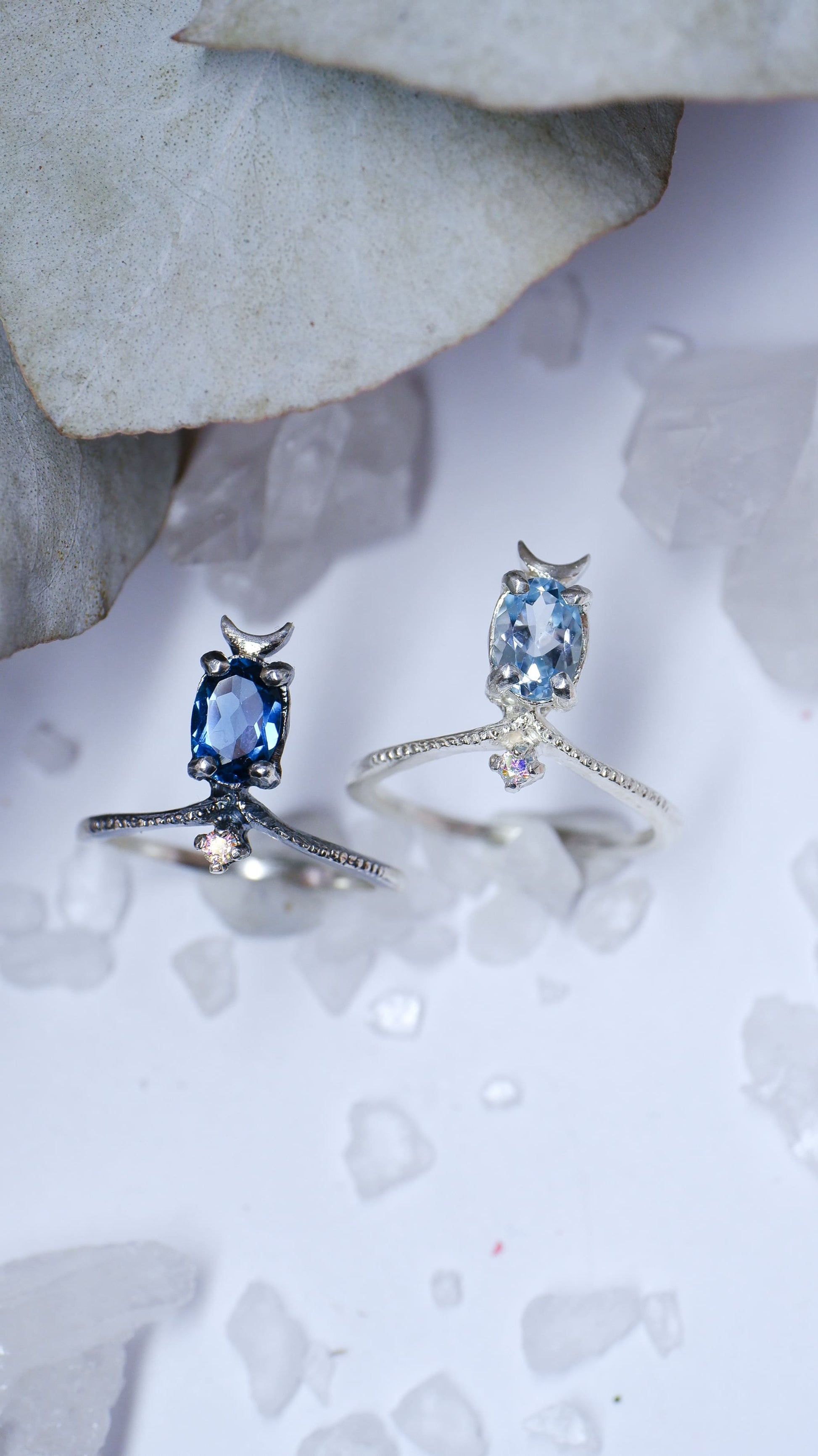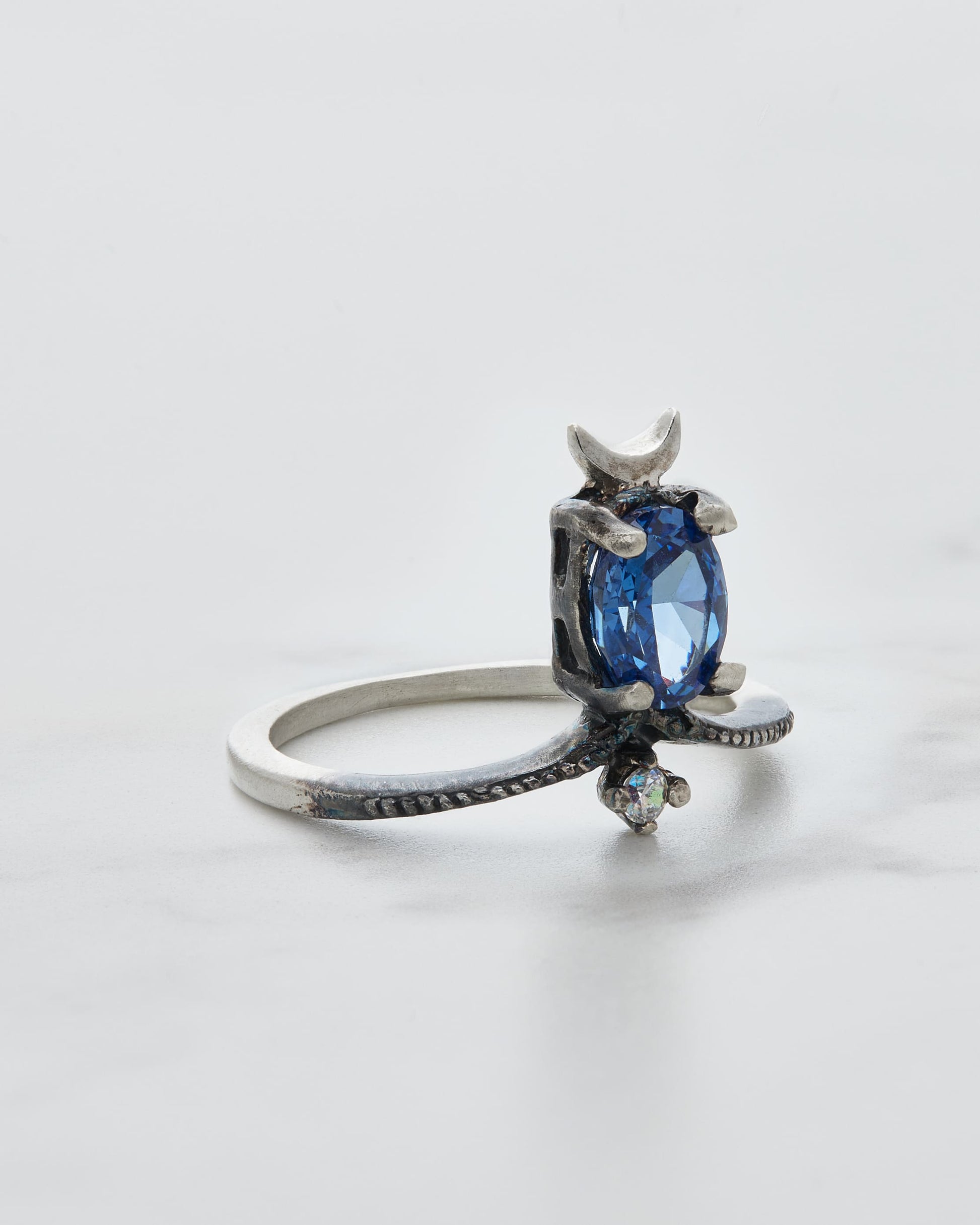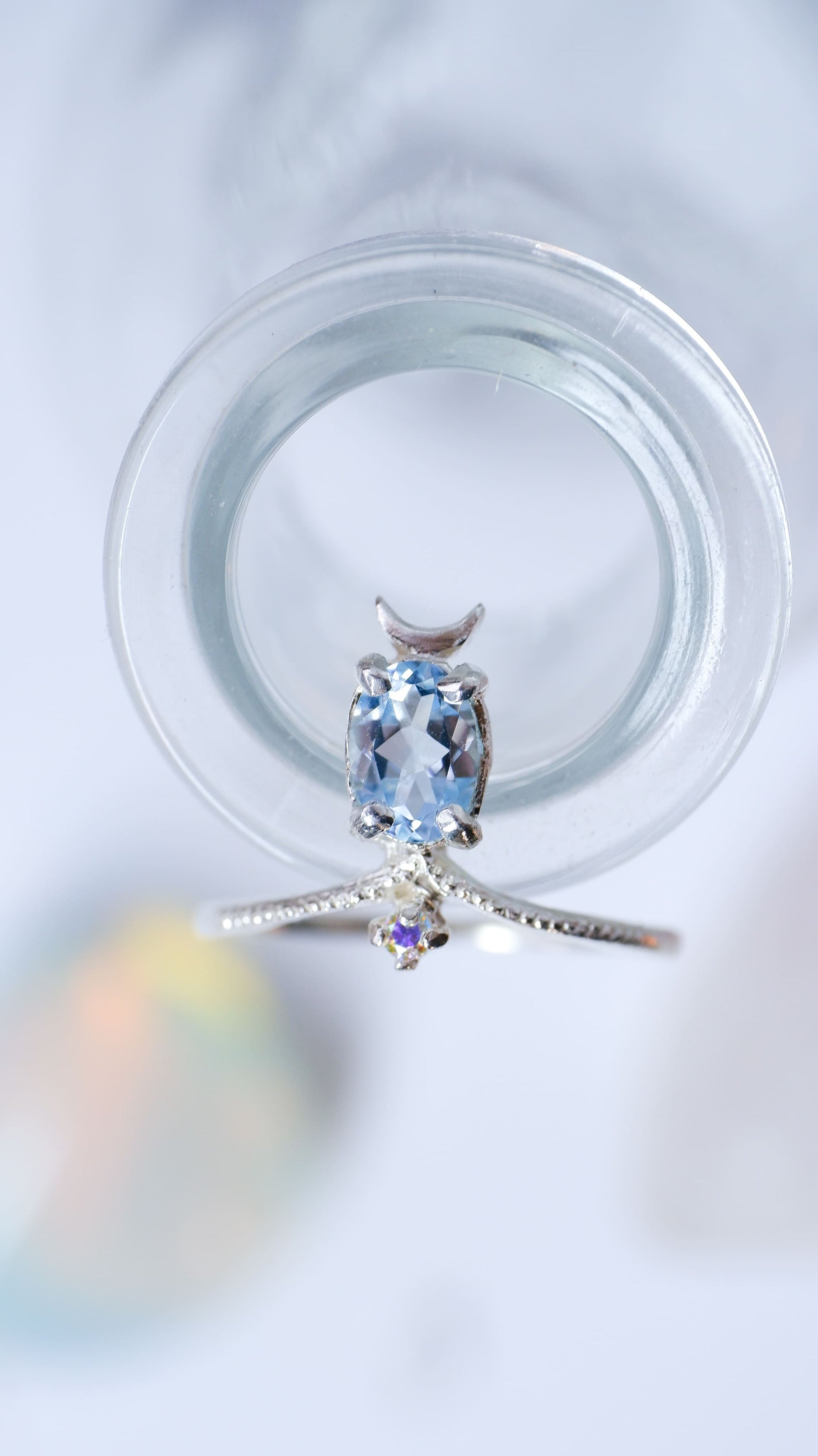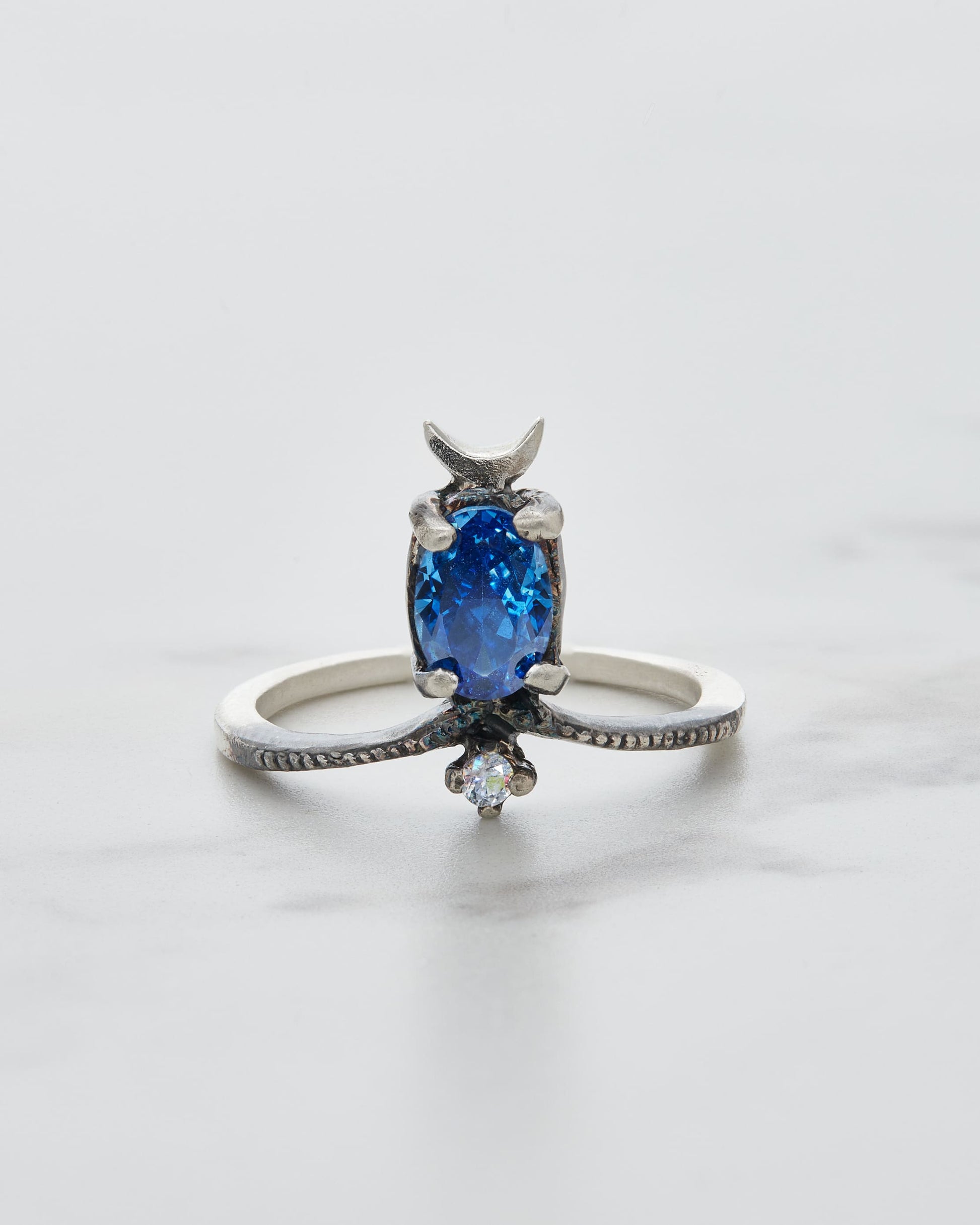 This ring has a witchy vibe in it. The young moon is floating above the night skyes.