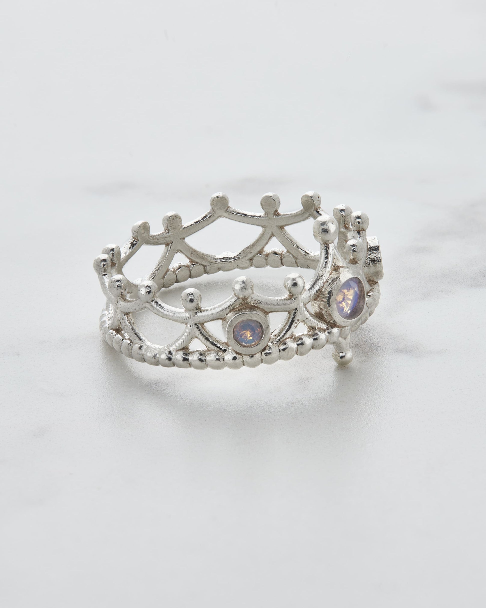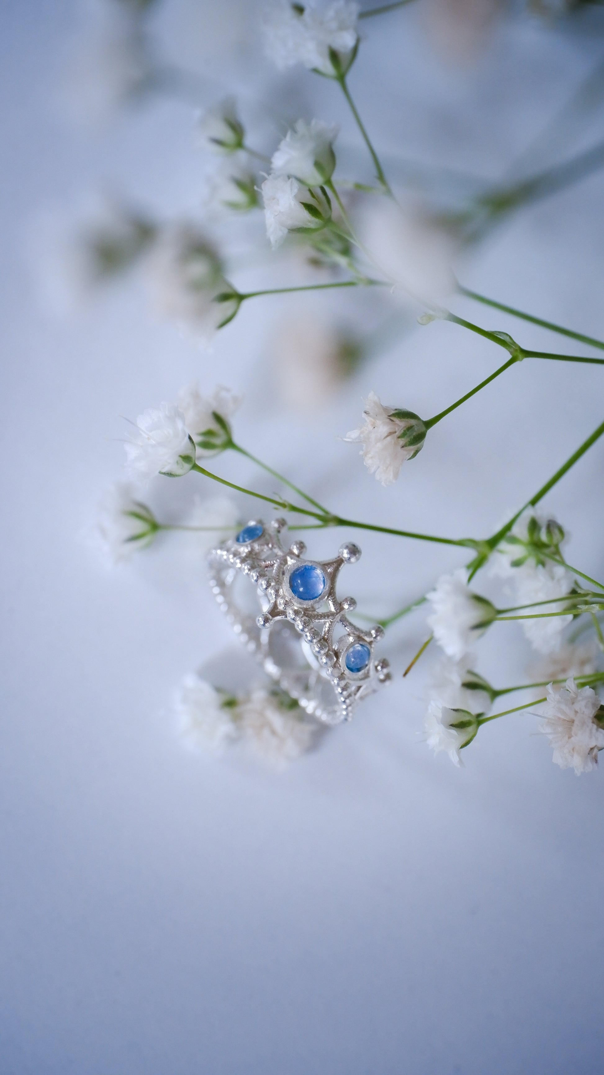 The ring comes in two variations, with moonstones of a blue hue, and with pink dewy zirconia.
