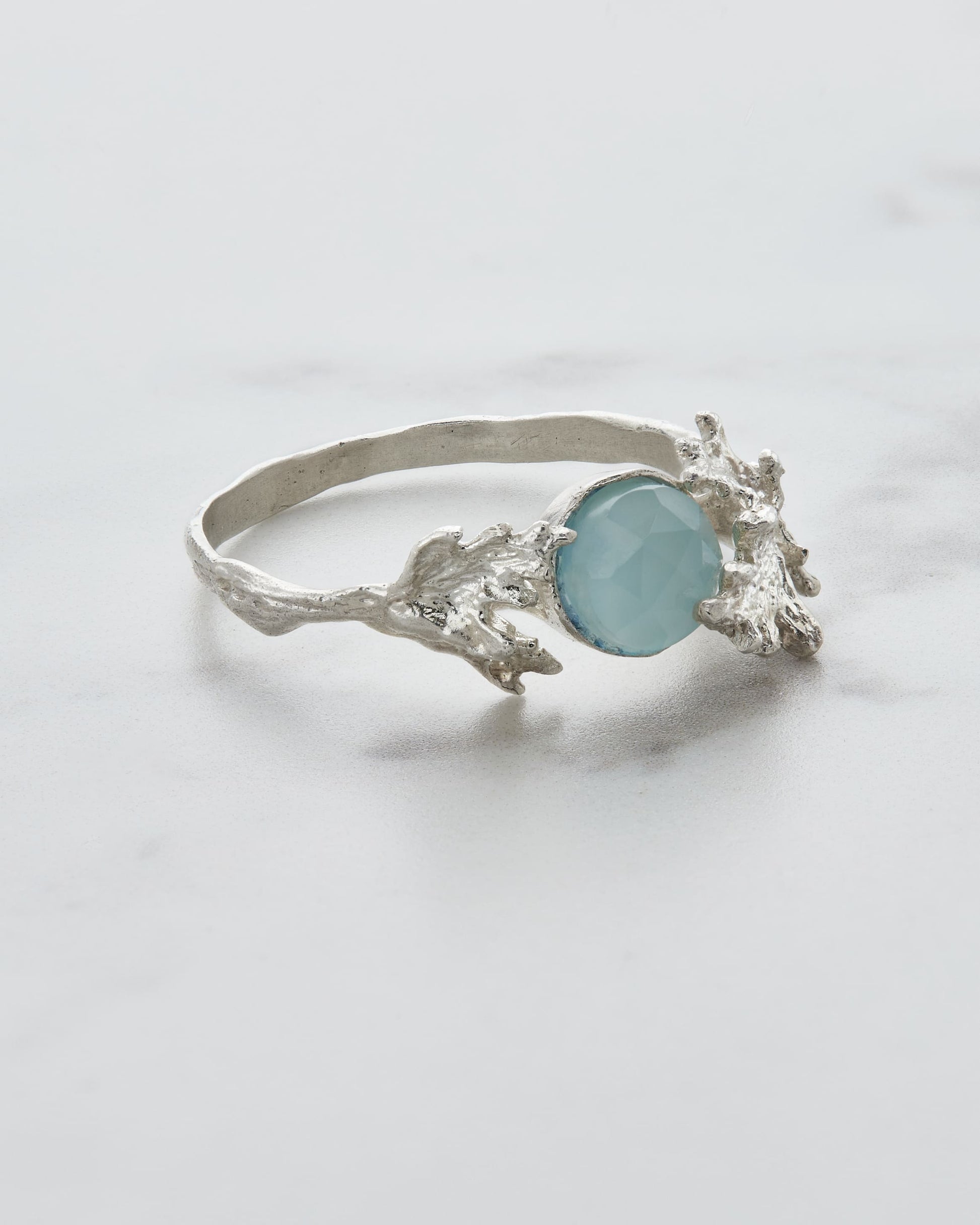 The drop of a moonstone hides under a white carved leaf.